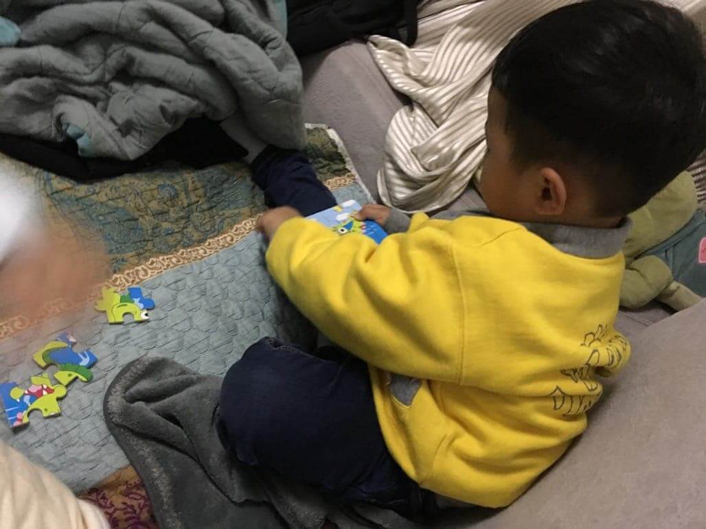 一开始让他自己拼,我发现他还不能静下心来,而且虽然知道整块拼图是什么但是拼的时候想不清楚整个图像,也没有方法,明明拼错了也说没有拼错。